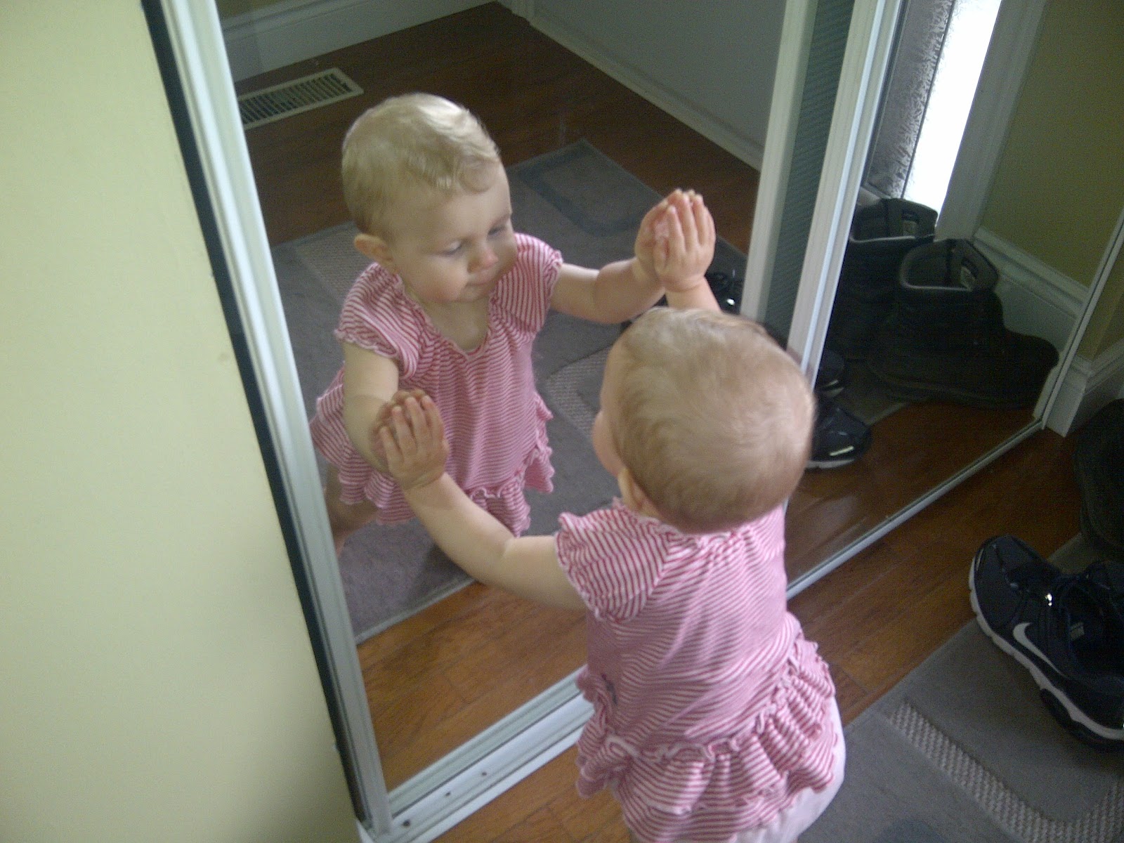 We went to visit my mom the other day and in the foyer she has these mirror doors on the closet. No biggie right. Until Adriana realized she could see herself in them! She's more active but slower at my mom's house because of the hardwood floors. Its hard on her knees sometimes. She normally doesn't make it that far out of sight but I decided to let her go exploring. Oh Boy! did she explore alright. Not only did she corner my mom's poor long-haired Chihuahua by the front door, she put her sticky hands all over the bottom part of the mirror. Did I mention she likes to give kisses in the mirror to herself? This time she added blowing bubbles on the mirror too. What a nice granddaughter eh? lol